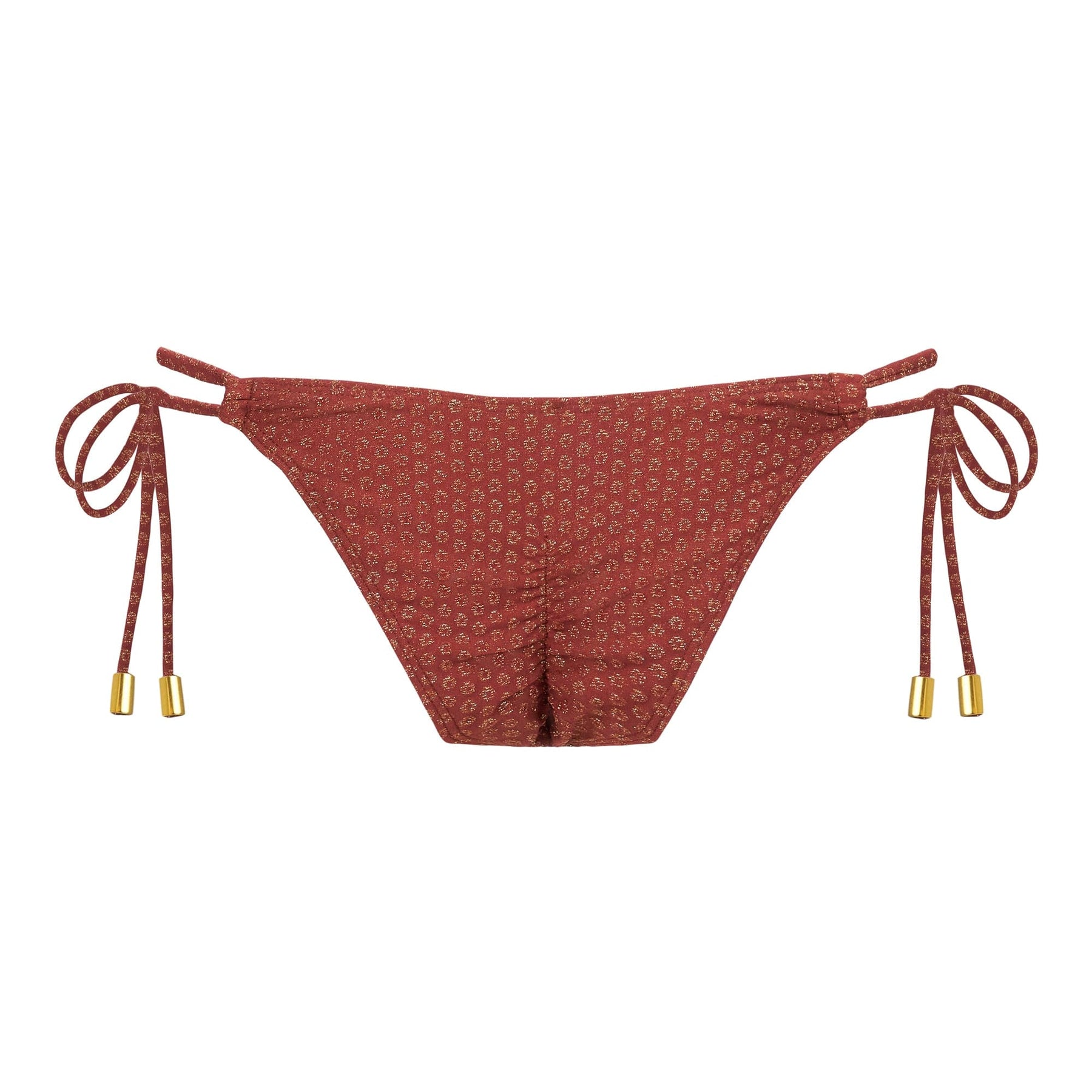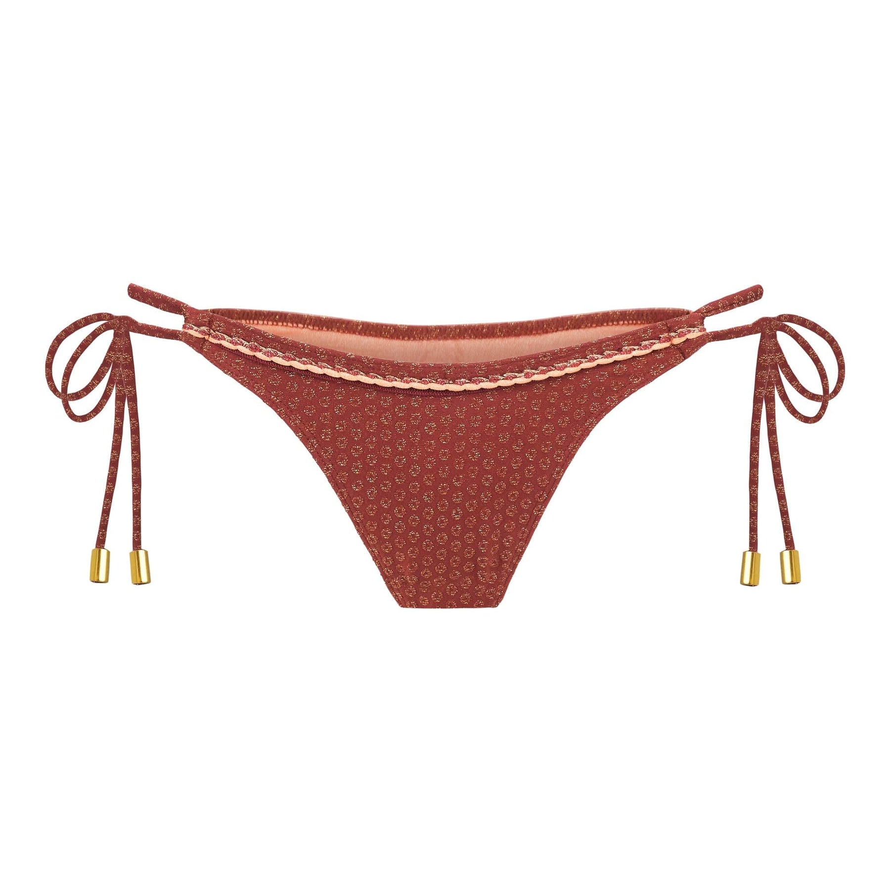 A timeless staple, the Akosha Jet Set Bottom is designed for the perfect fit with adjustable tie sides and a rouched, cheeky back that enhances your natural curves. Crafted from luxurious Italian maroon and gold fabric, this piece is lined with buttery-soft peachy Italian fabric for ultimate comfort. Delicate peachy trim details and gold accents add a touch of elegance, making this bottom a must-have for effortless, elevated swimwear style.