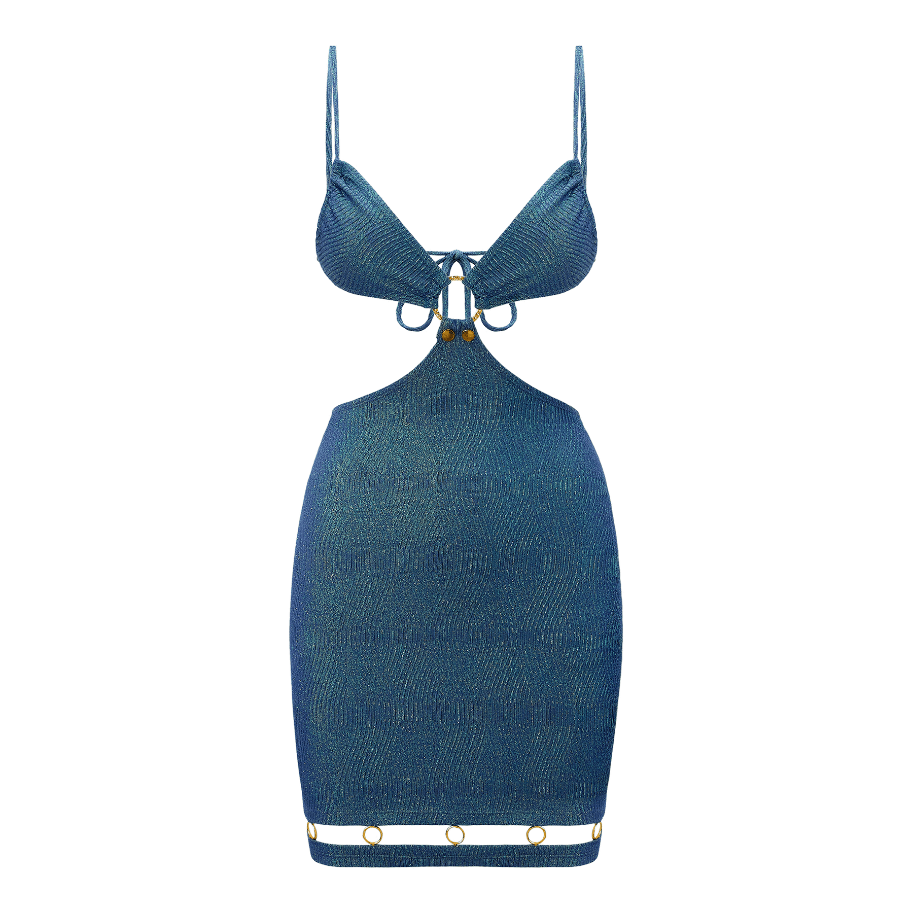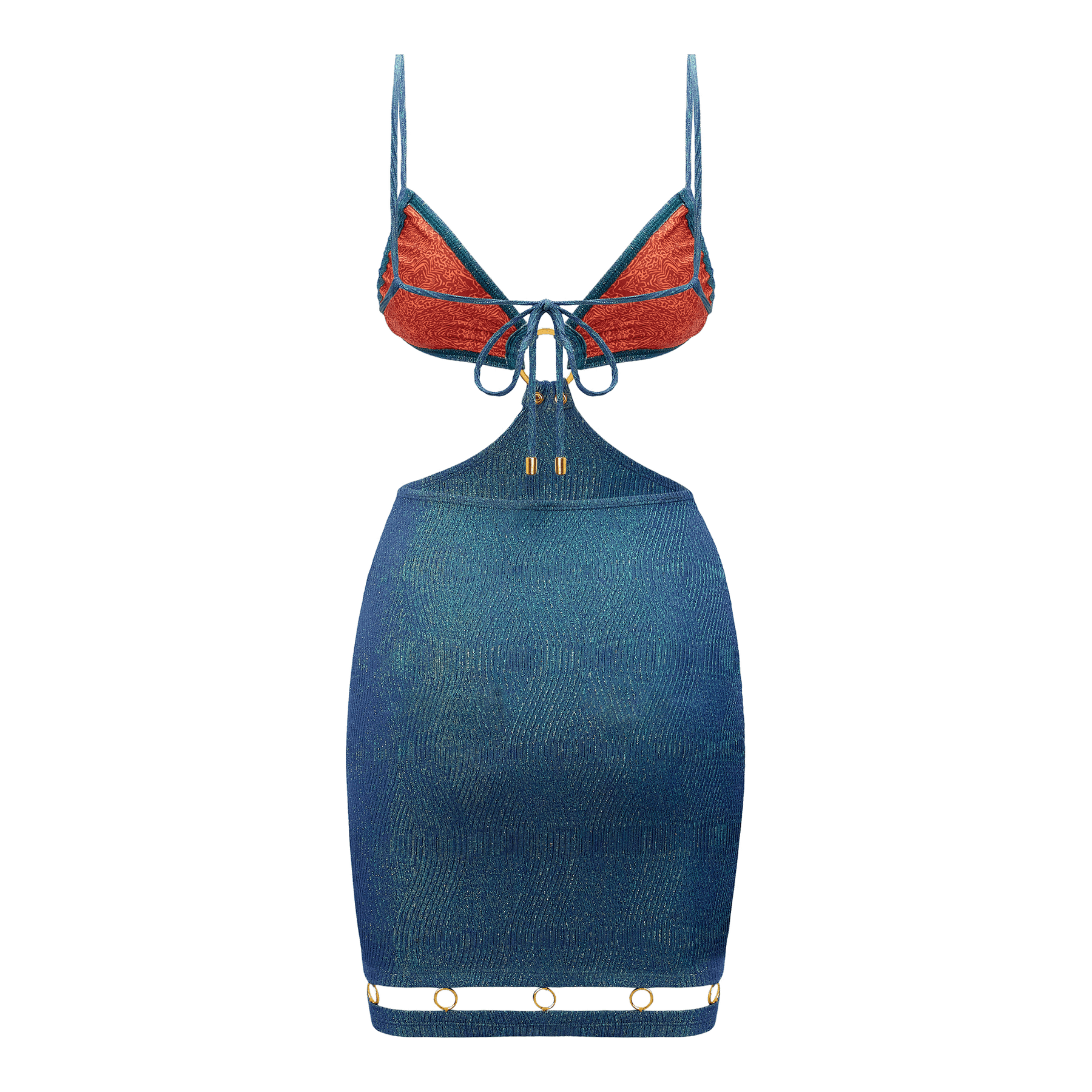 A shorter version of the Rosario skirt but made in the same luxurious Italian mermaid shimmer fabric, the eye-catching Rosario Mini is undeniably flirty and feminine. Designed to be worn with the Jet Set top–and equally stunning on or off the beach–this versatile piece features two gold snaps that attach to the top’s hammered gold ring.