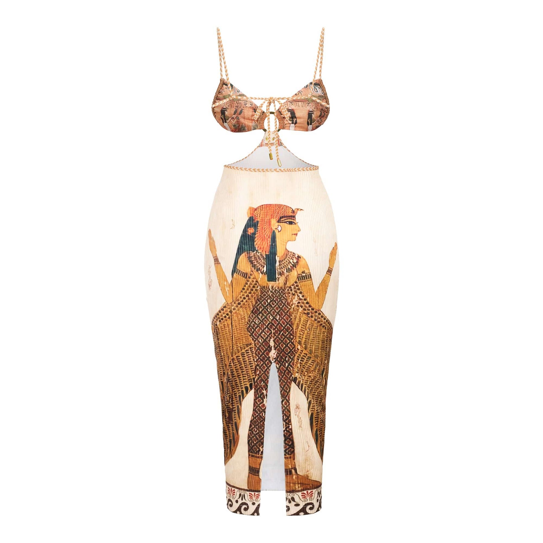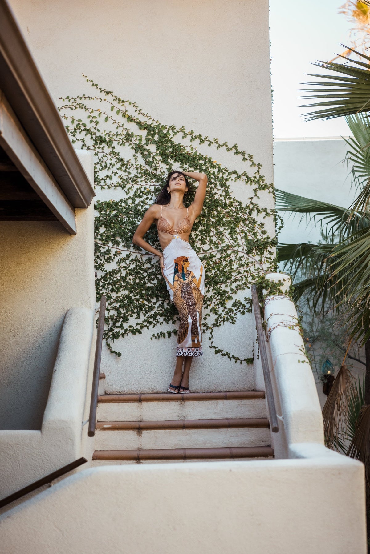 Introducing the Rosario Skirt in the exclusive Nefertiti print—your favorite cover-up concept reimagined in a stunning new design. This never-before-seen piece redefines luxury beachwear, effortlessly transitioning from a chic beach look to evening sophistication. With two gold snaps that seamlessly attach to the hammered gold ring of our Jet Set top, the Rosario Skirt flatters your figure and radiates timeless elegance. Sold as part of a set with the Jet Set top, it pairs beautifully with our Cinco Bottom, offering an elevated swimsuit-to-dress combination for those who seek refinement and unparalleled style.