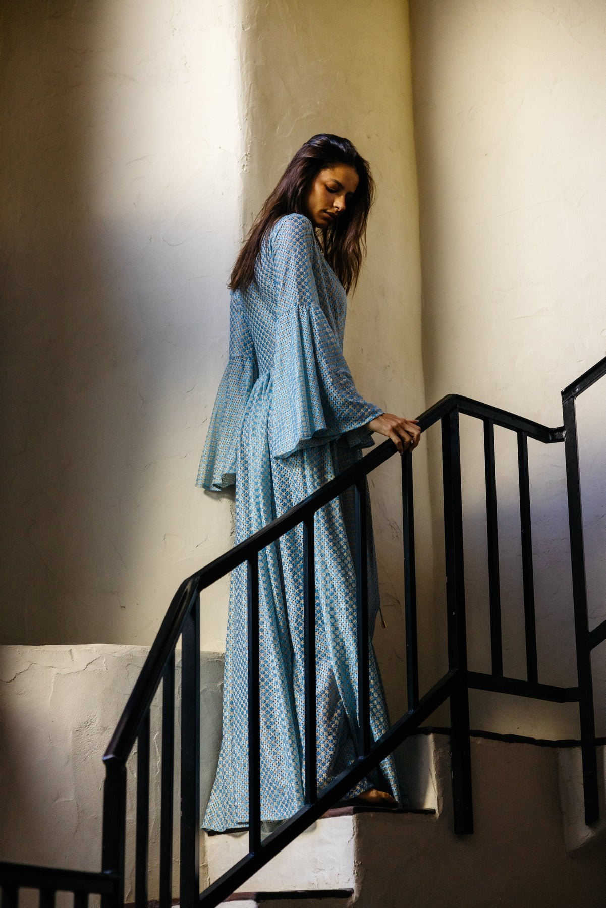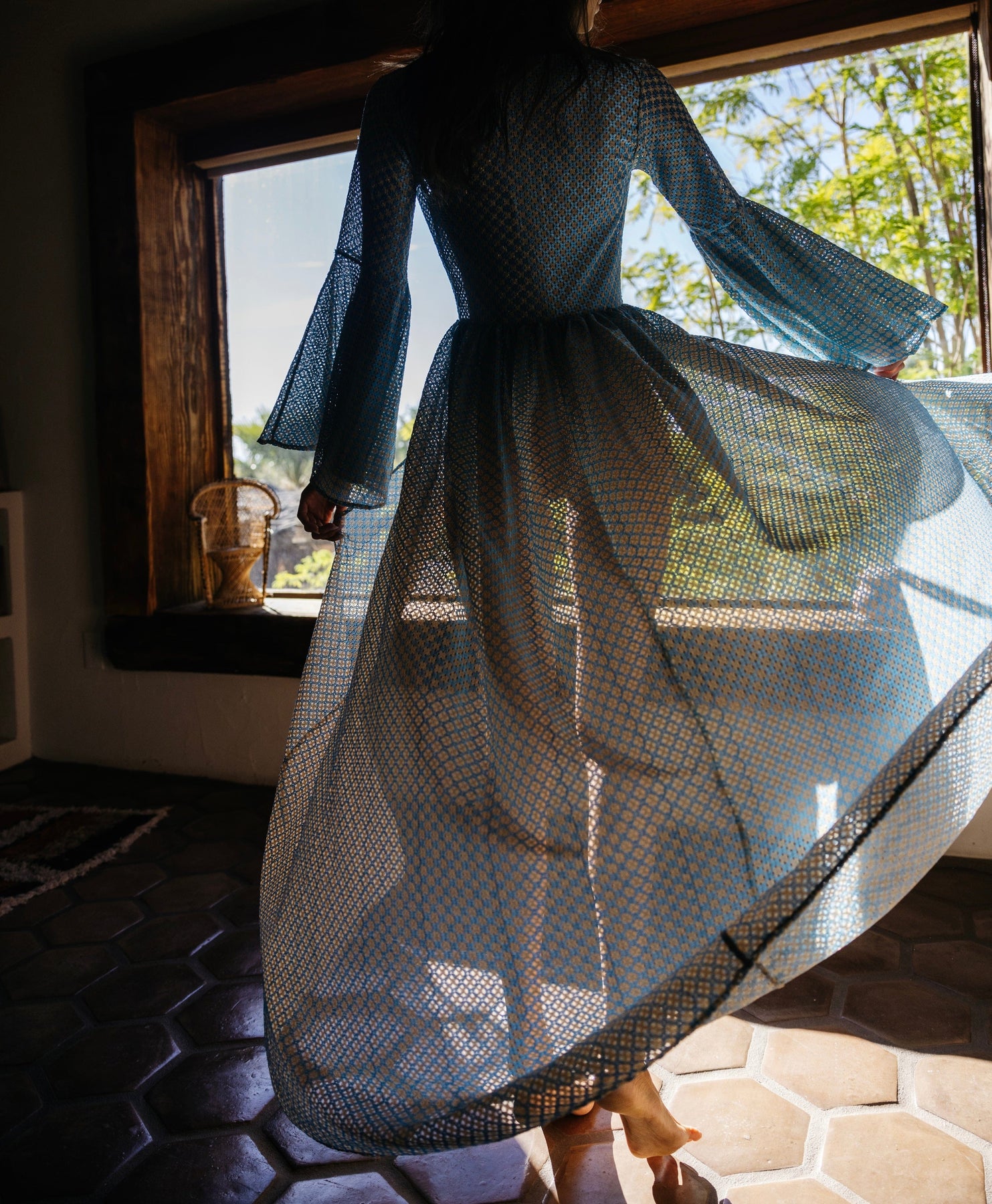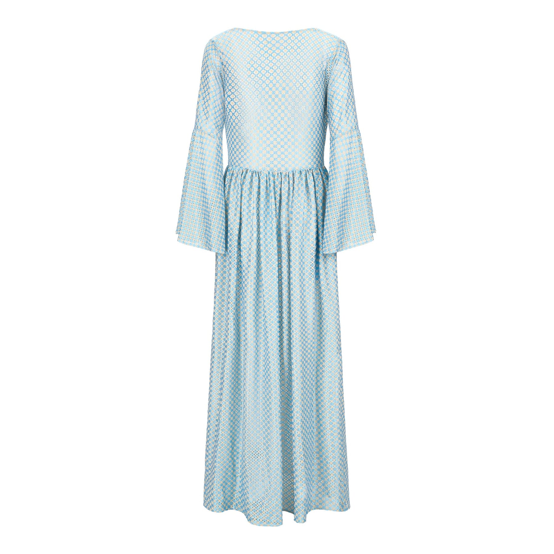 Delicate gold foil lurex detailing shimmers across the fabric, complementing the robe’s ethereal movement. The bell sleeves add a touch of drama, while the sweeping floor-length back creates a regal silhouette. Designed for both style and ease, the open-front design allows for graceful movement, secured by a luxurious tie rope closure adorned with gold tips for an extra hint of opulence.