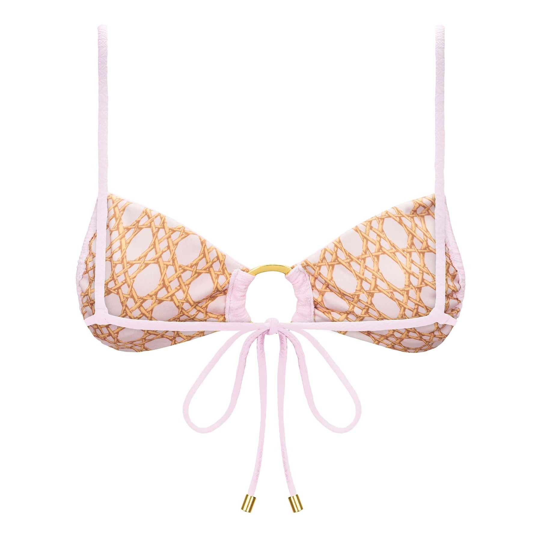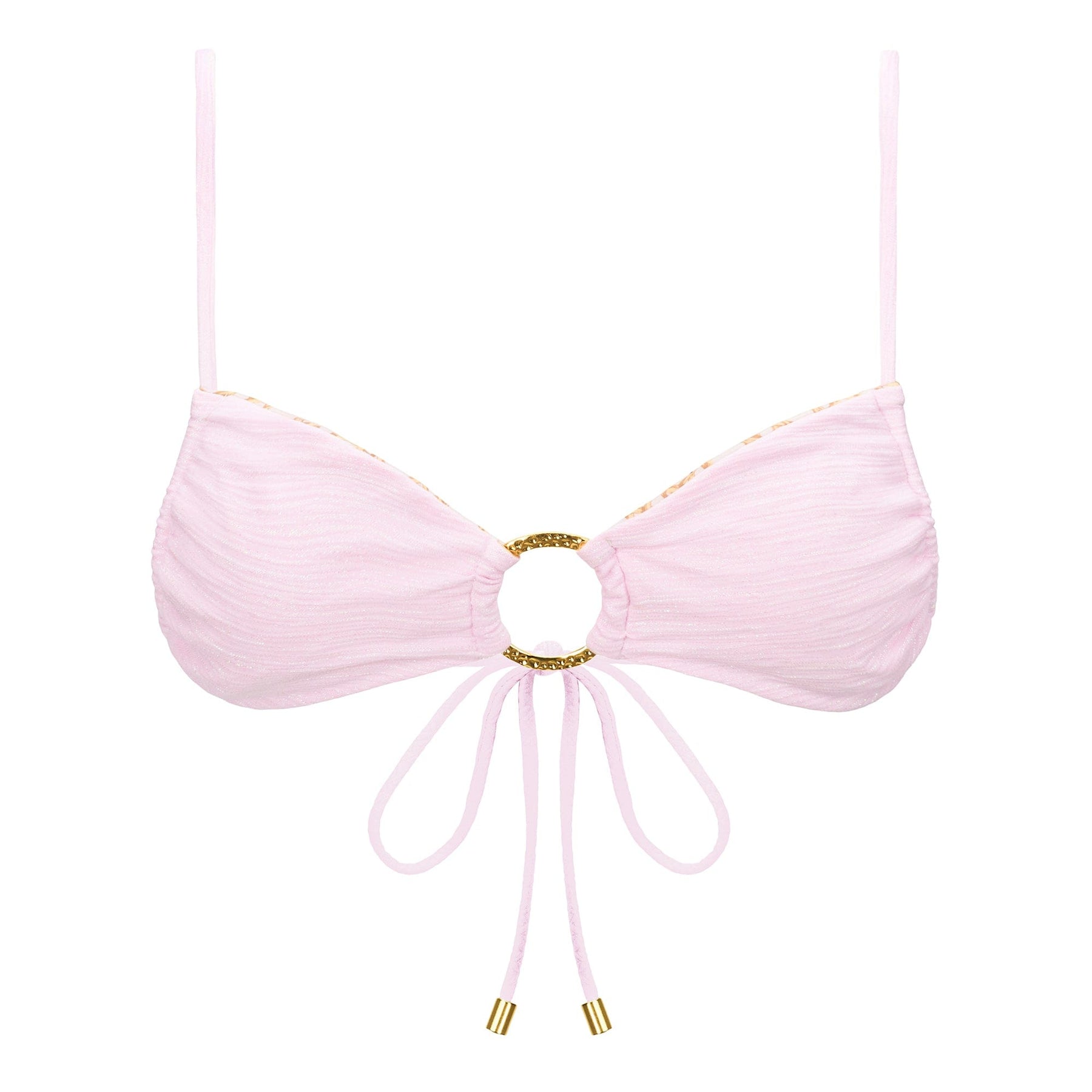 A classic yet elevated bandeau with adjustable cups and ties that can be worn two different ways–and a stunning hammered gold ring accent that does more than attract attention. Designed to be paired with our jet set bottom or show pony bottom.