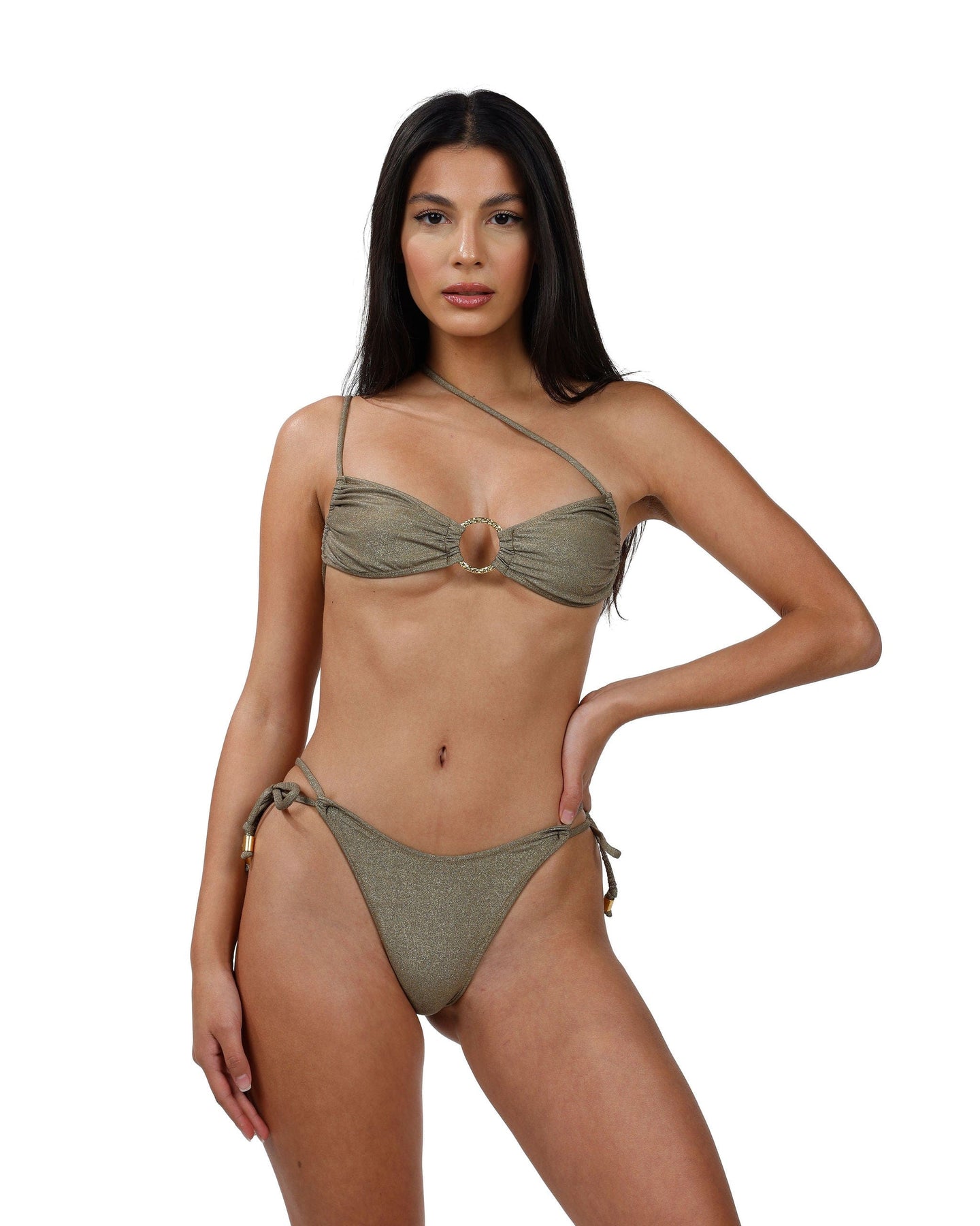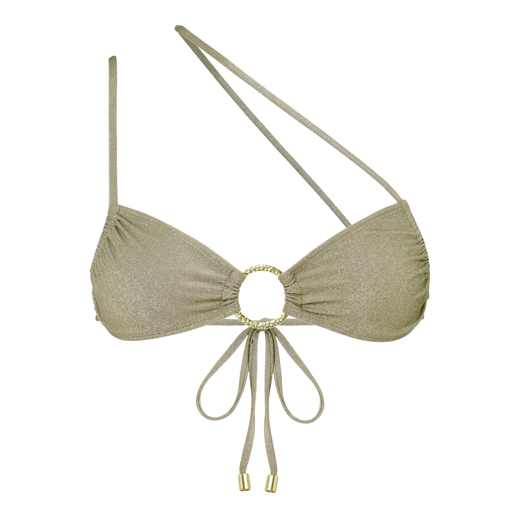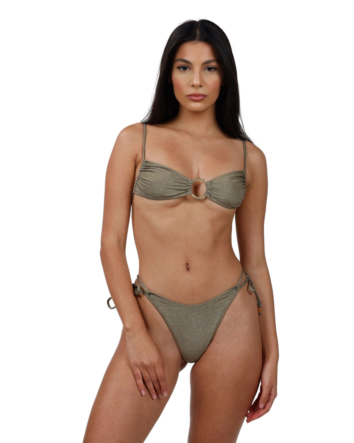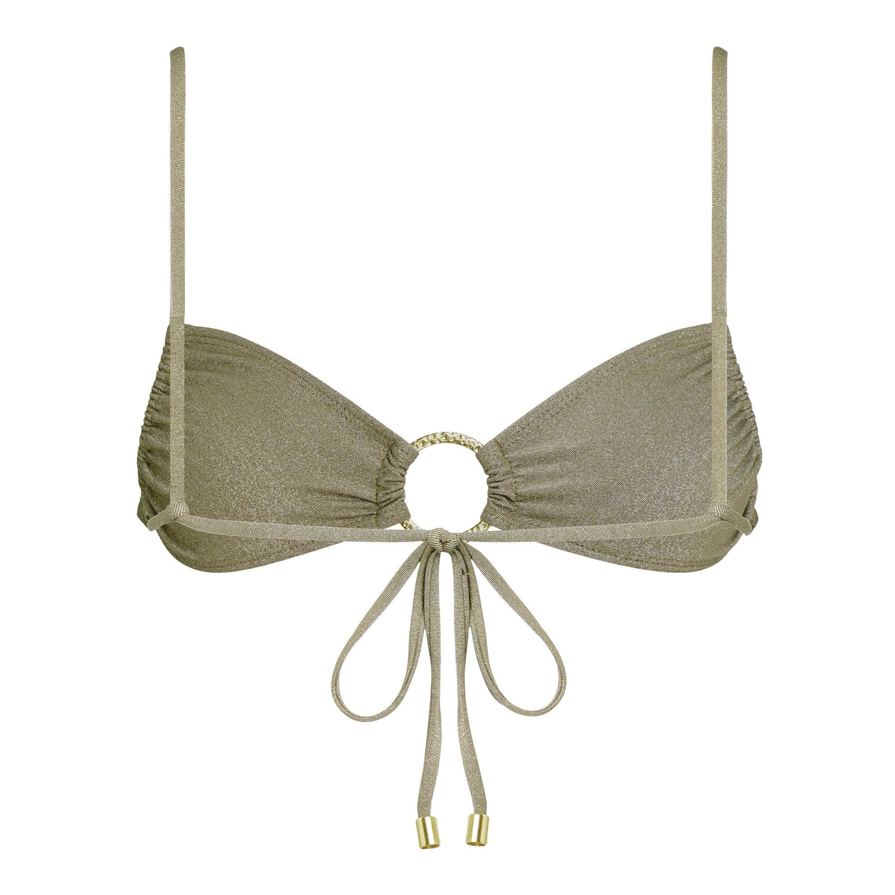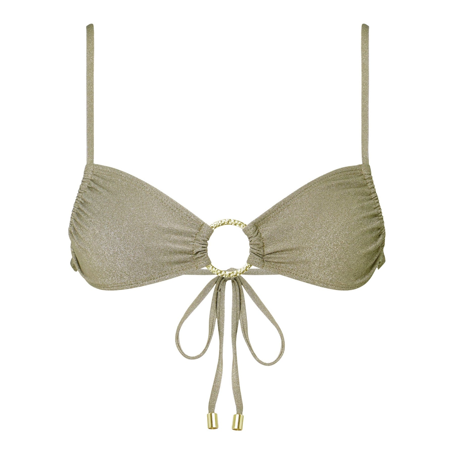 This top is made to go places. Flaunt around the world in this 90s classic silhouette — a piece that elevates any beach look. The Jet Set bikini top features a bandeau-style cup with a gold ring at the center, sliding cups to adjust and ties at the back. Warning: this top may cause compliments!